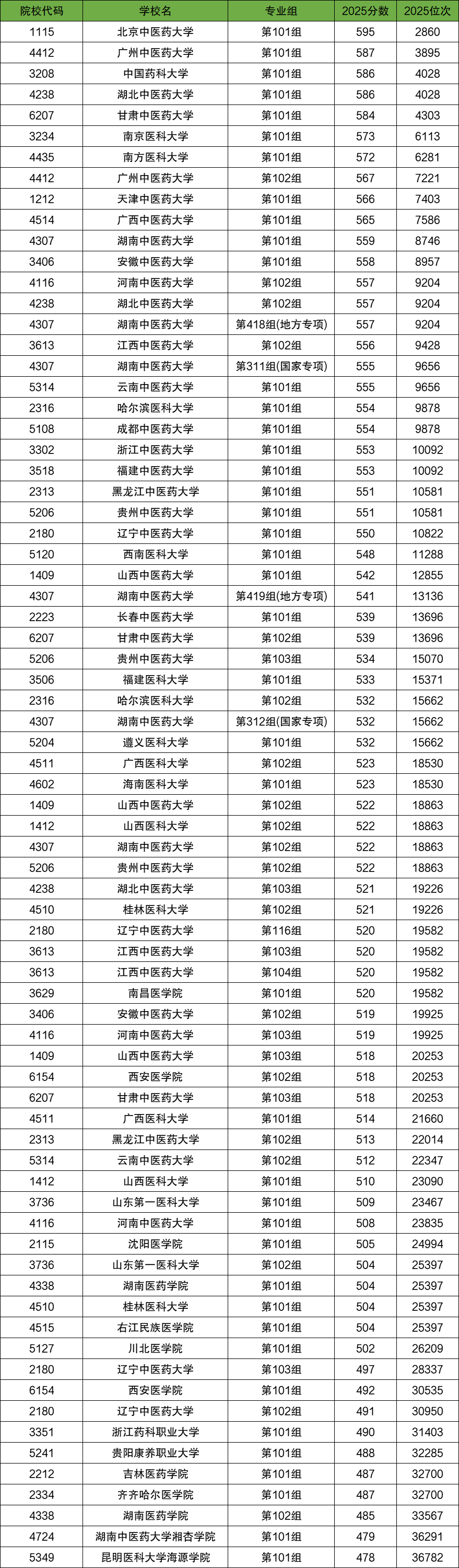 历史类分数线最高、最难考的是北京中医药大学(代号1115),2025年最低分595,最低位次2860名。其次是广州中医药大学(代号4412),2025年最低分587,最低位次3895名。