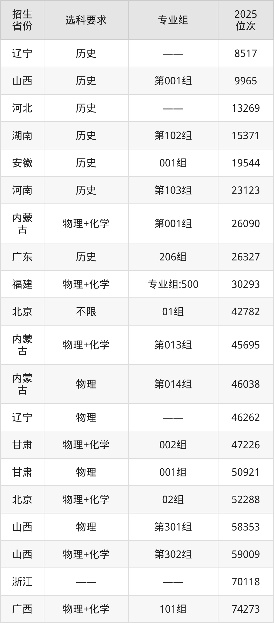 北京服装学院2025年在全国各省的位次差异较大,最高位次是8517位(辽宁历史类)、最低位次是162184位(山东)。各省具体位次请看下图: