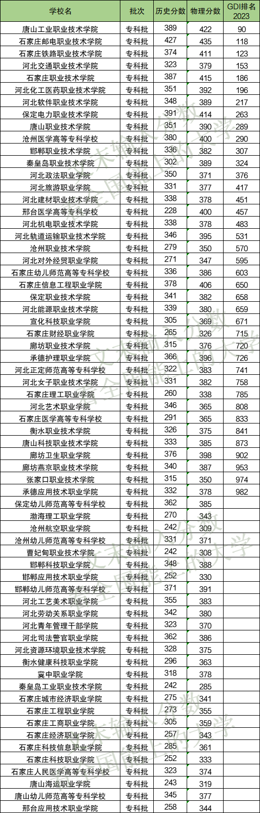 下表为河北省所有专科学校分数线及全国排名。