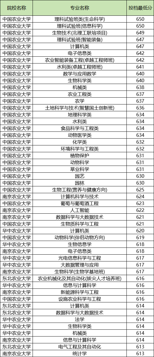 中国农业大学(理科试验班(信息科学))650分、中国农业大学(生物技术(北理工联培项目))649分、中国农业大学(理科试验班(智能装备))647分、中国农业大学(计算机类)647分、中国农业大学(电子信息类)642分、中国农业大学(农业智能装备工程(卓越工程师班))642分、中国农业大学(法学)641分、中国农业大学(水利类(卓越工程师班))641分、中国农业大学(数学与应用数学)640分