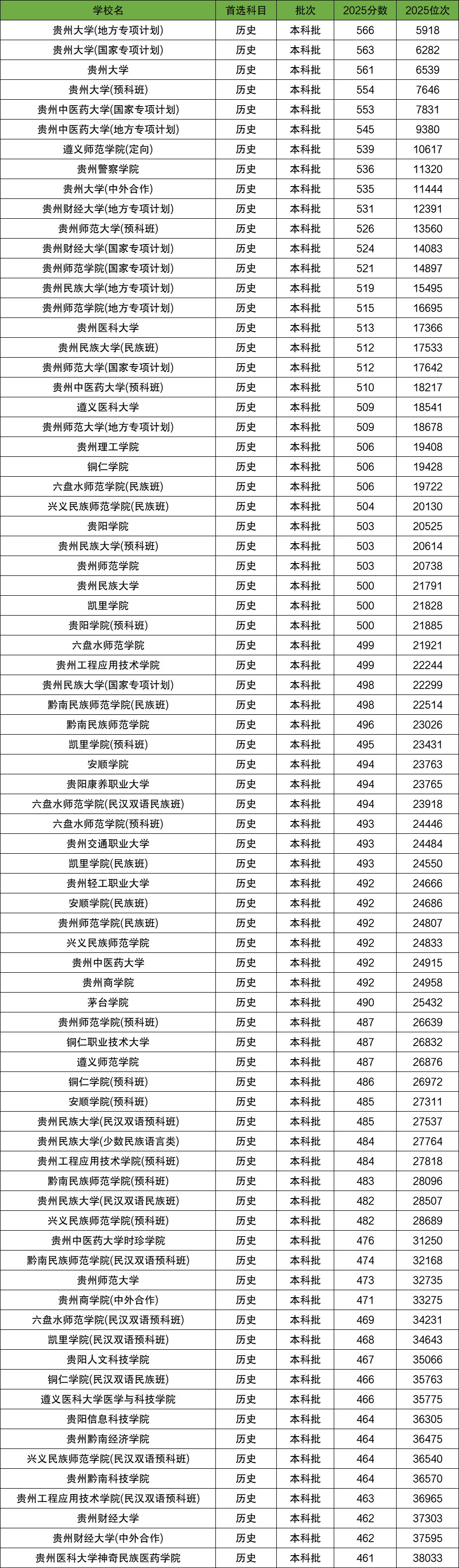 省内分数最高的大学是贵州大学(地方专项计划),2025年录取分数线为566分,对应最低位次为5918名。这也是贵州省内历史类考生最难考的大学之一。