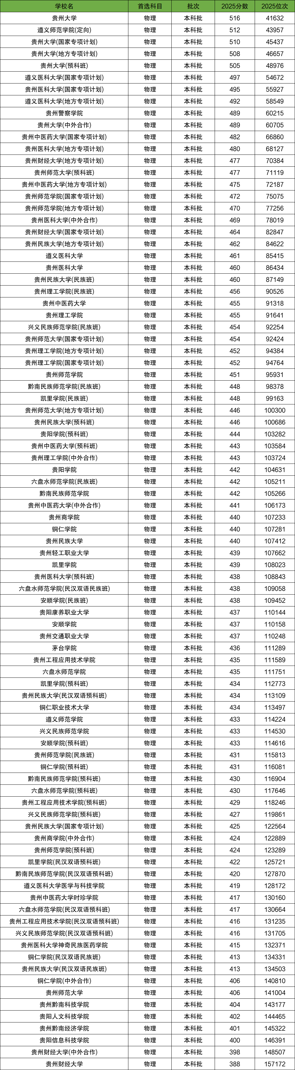 2025年贵州各高校录取分数线如下:本科物理类388分~516分,历史类461分~566分。