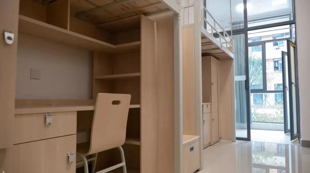 吉利学院宿舍为6层电梯公寓,可通过指纹、刷卡、密码解锁,宿舍均为四人间,上床下桌,每人分有四个柜子,储物空间较大,宿舍内有独立卫浴,干湿分离,并配有空调。周日到周四晚熄灯断电时间为23:00,周五、周六则不熄灯断电。(空调洗漱区不断电)公寓可自己寻找同级同专业的同学组队,选择心仪的房间。