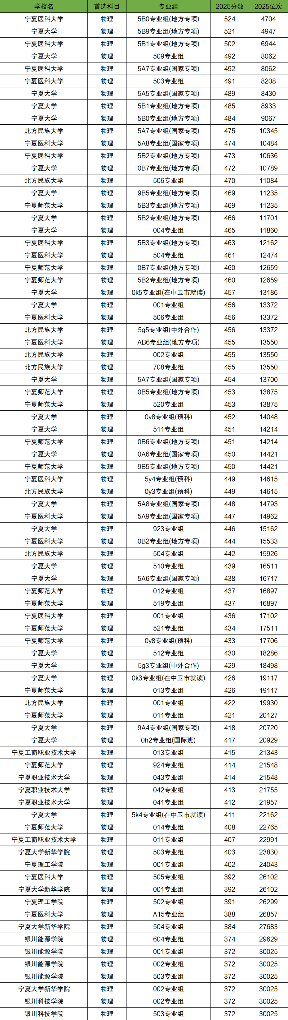 以宁夏2025年的招生数据为例,在物理类方面,宁夏各本科大学的录取线在372-524分之间,位次在30025-4704名之间;在历史类方面,各本科大学的录取线在404-530分之间,位次在9485-1384名之间。