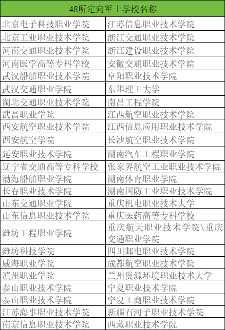 定向培养军士招生院校一共有48所,分别是北京电子科技职业学院、北京工业职业技术学院、河南交通职业技术学院、河南医学高等专科学校、武汉船舶职业技术学院、武汉交通职业学院等。定向培养军士录取分数线一般在300分左右,各省不一样,如2024年内蒙古自治区文科最低328分、理科326分。