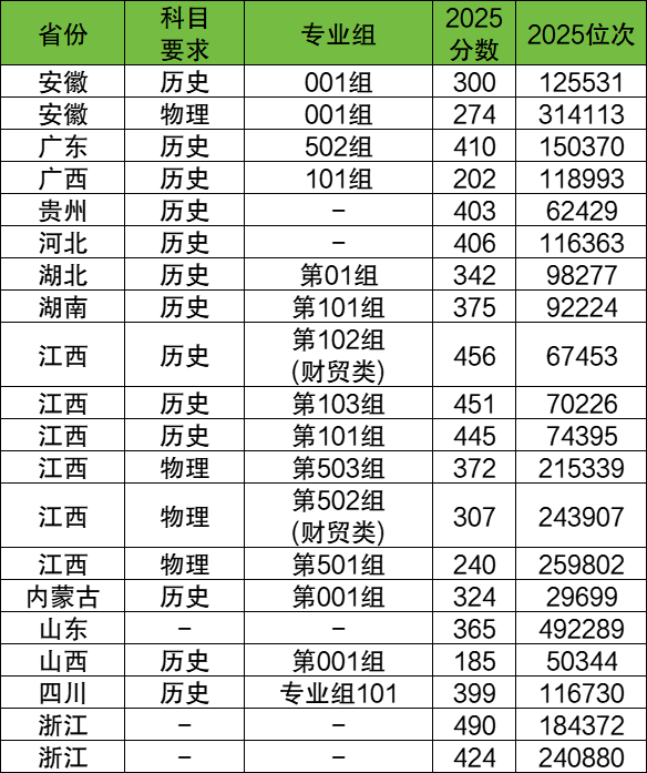 江西省内同类公办学校2025年普通类录取线多集中在410-500分区间,跨境电商、国际经济与贸易等涉外类专业热度更高;