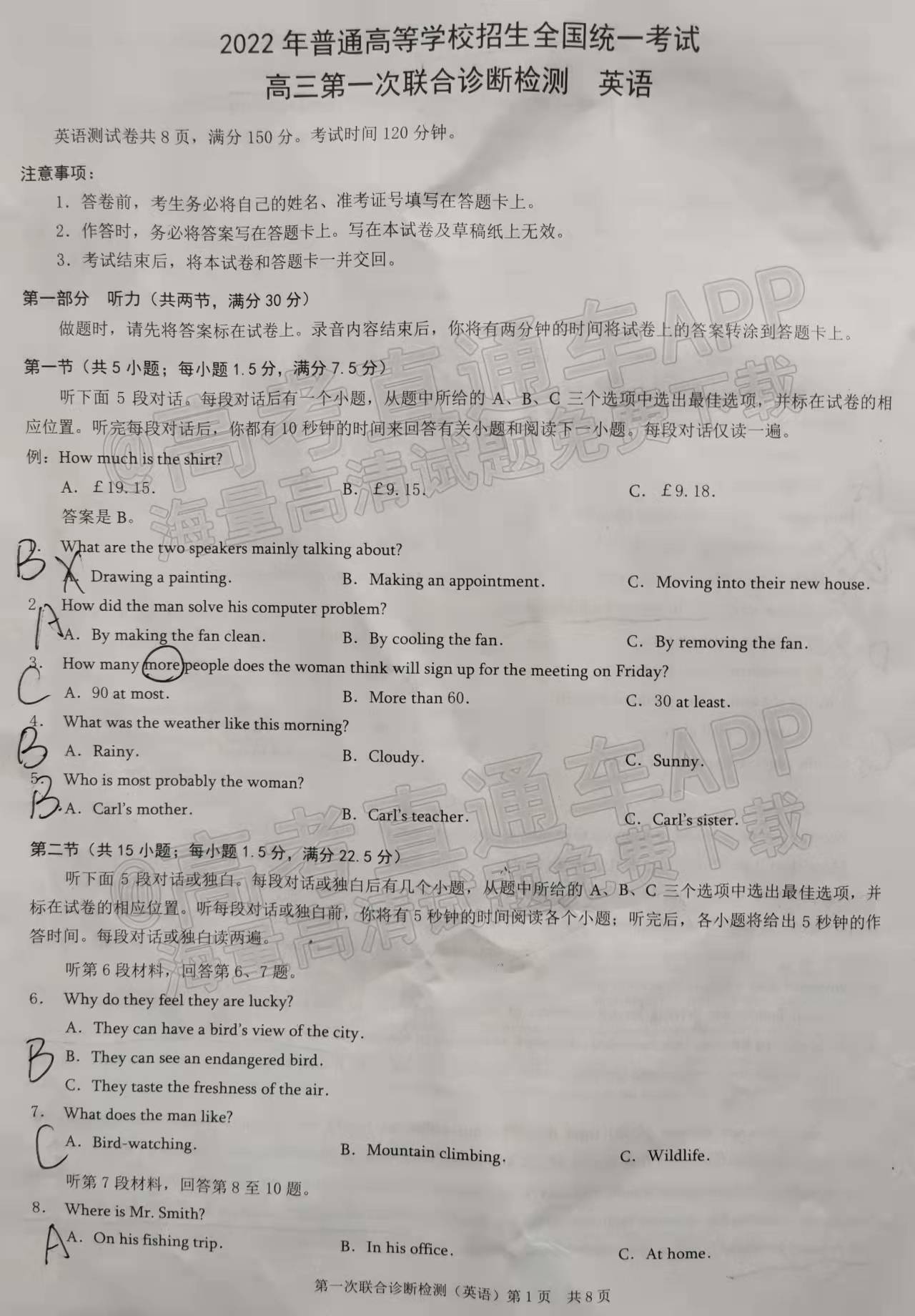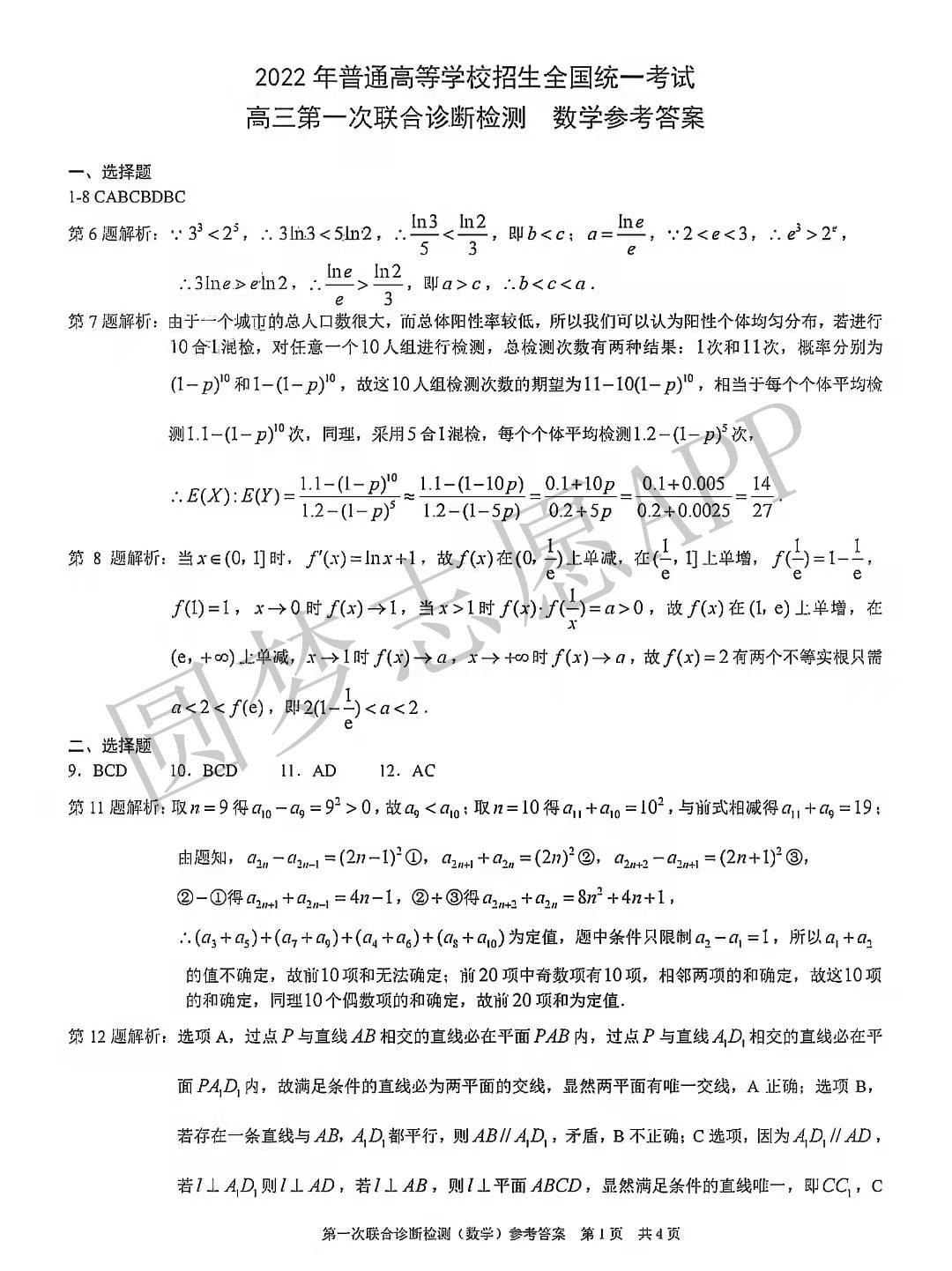 一.重庆康德卷一诊2022各科答案及试卷