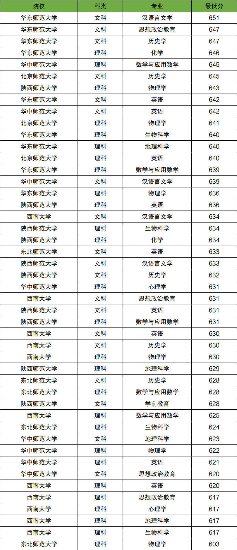 除此之外还有西南大学、北京师范大学、陕西师范大学等,下表为具体学校名单及分数线。