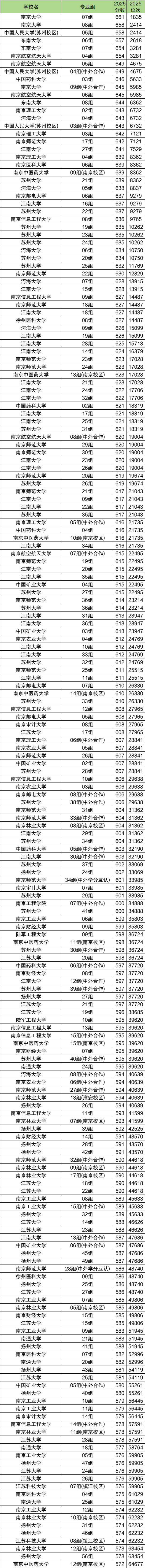 最难考的是南京大学07组,2025年录取最低分661分,对应省位次是1835名;最好考的是金陵科技学院、江苏理工学院、苏州工学院、无锡太湖学院等,2025年最低分463分,对应省位次是205975名。