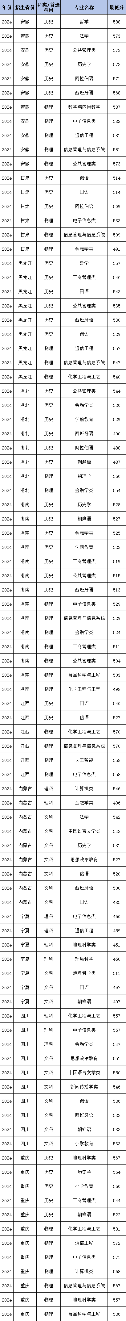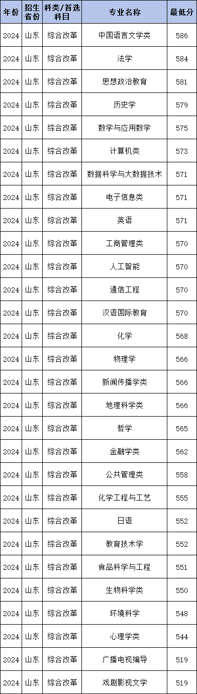 2024年山东师范大学国家专项计划在湖北录取最低分历史类为487分、物理类为554分,历史组收分最低的专业为朝鲜语、物理组收分最低的专业为金融学类。