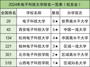 在2024年校友会发布的电子科技大学排名中,排名前六的电子科技大学分别是电子科技大学、西安电子科技大学、杭州电子科技大学、北京电子科技学院、桂林电子科技大学、山西电子科技学院。