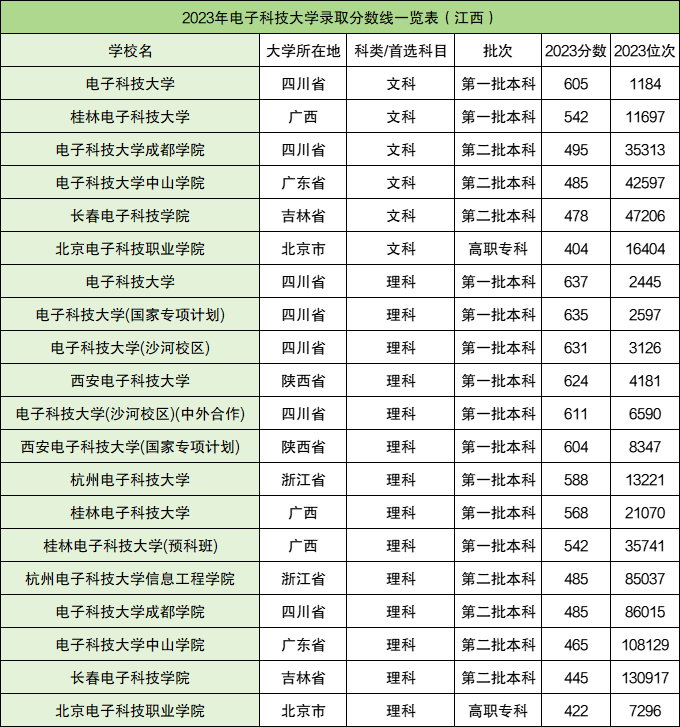 在江西文科中,报考难度最大的电子科技大学是电子科技大学,2023年的投档线是605分。电子科技大学的最低录取线是404分,共有一所电子科技大学在该分数上,包含有北京电子科技职业学院。