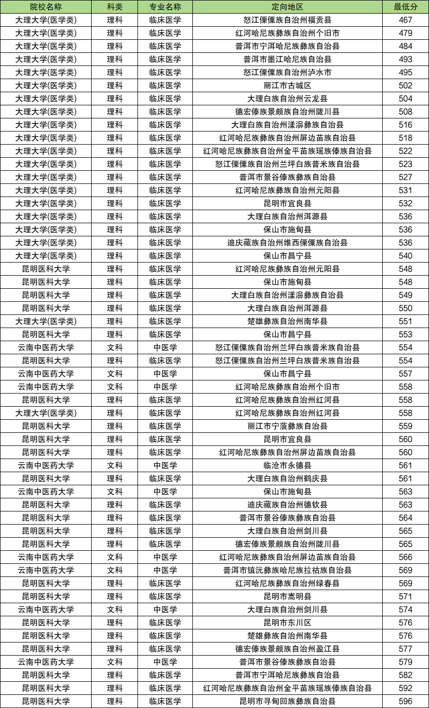其中文科生只能报考云南中医药大学的免费医学生,最低收分为554分,对应定岗单位所在地为怒江傈僳族自治州兰坪白族普米族自治县。