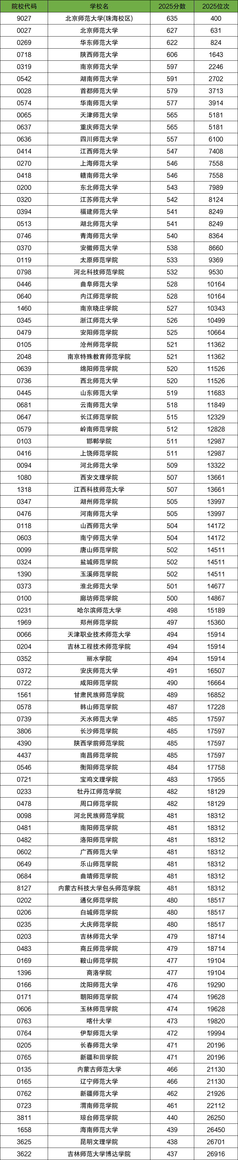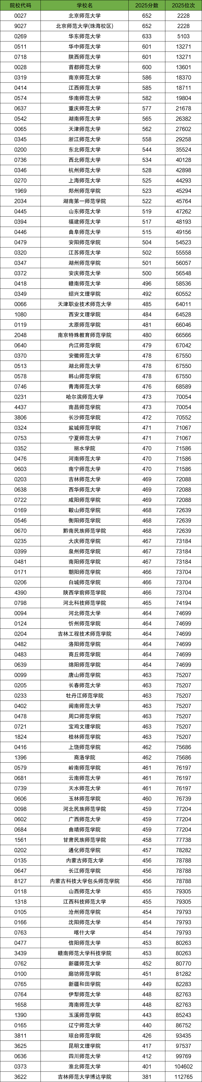 2025年师范大学历史类最低录取分数线是437分,收分最低的学校是吉林师范大学博达学院(3622),对应最低位次是26916名。也就是说对于历史类考生来说,高考成绩最低需要持平本科线,省排位在26916名以内才有机会上师范大学。