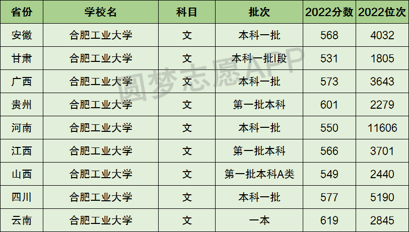 根据下表数据可知,传统高考地区里有7个地区的合肥工业大学文科考生在600分以下,只有贵州、云南在600分以上。