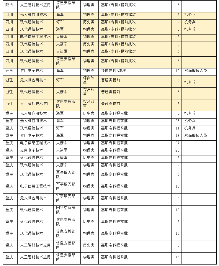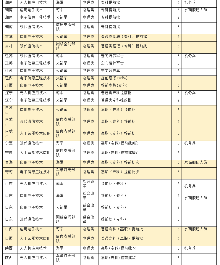 考生须在专科提前批填报“定向培养军士”学校以及专业代码。