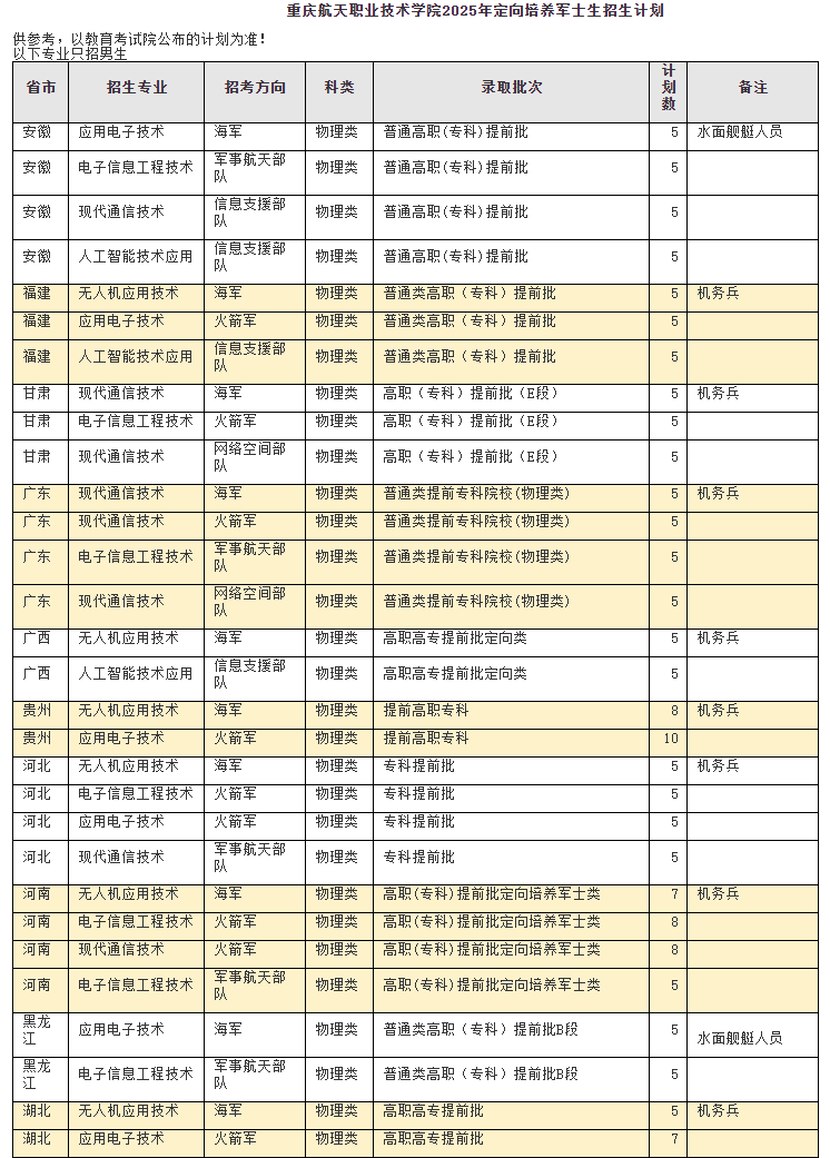 以下为2025年重庆航天职业技术学院定向培养军士招生简章中的重要信息,供各位想要报考重庆航天职业技术学院的同学参考。