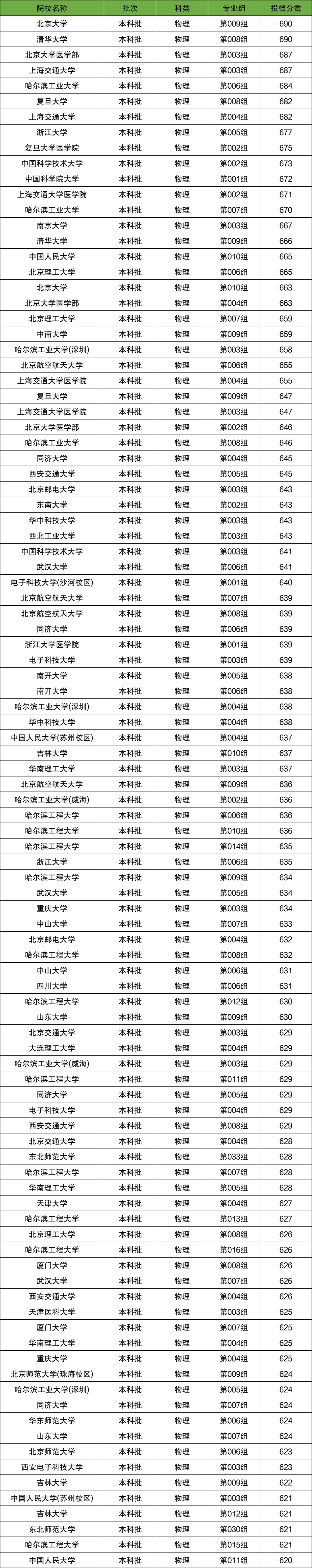 本科招生录取的大学中,录取分数线最高的是北京大学(第009组)、清华大学(第008组),2025年最低分是690分,对应全省位次是第61名。分数线排名靠前的还有北京大学医学部(第003组)687分、上海交通大学(第003组)687分、哈尔滨工业大学(第006组)684分等。