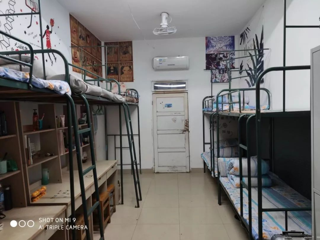 新寝室为6人间,上床下桌,有独立卫生间和阳台,还有公共卫生间,走廊内配有热水供应,风扇、空调、是上下铺,6人间1000元/年,8人间800元/年。
