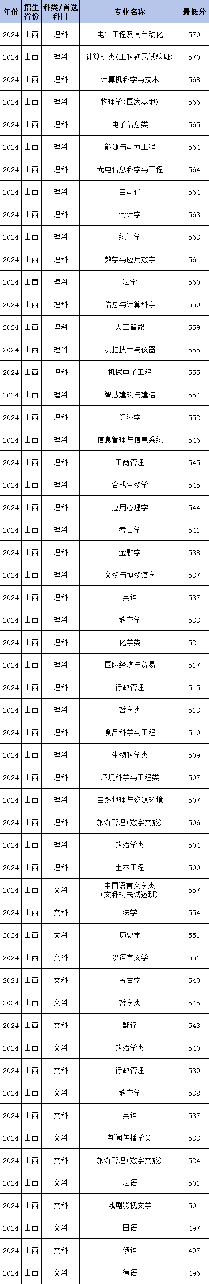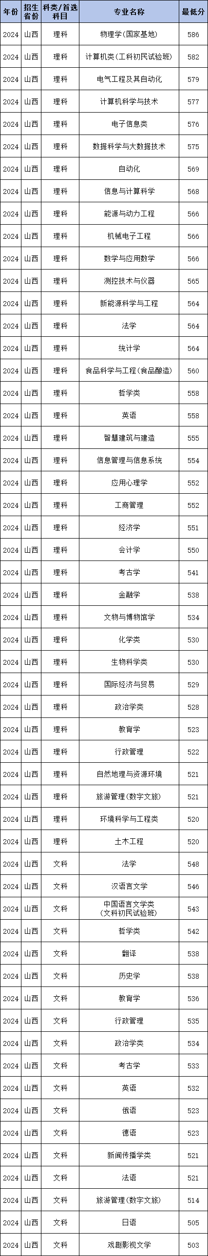 2024年山西大学国家专项计划在山西录取最低分文科为503分、理科为520分,文科收分最低的专业为戏剧影视文学、理科收分最低的专业为环境科学与工程类和土木工程。