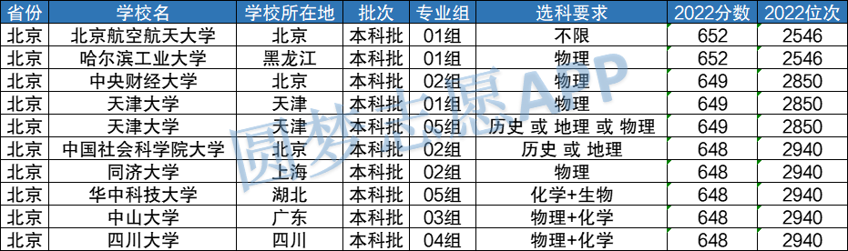 可以看到,2022年北京省高考650分左右的考生可以报考北京航空航天大学652分、天津大学649分、中国社会科学院大学648分等。