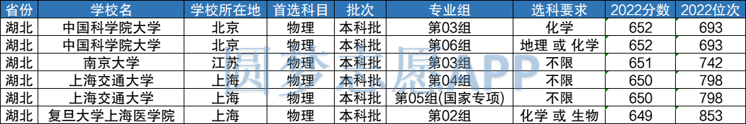 可以看到,2022年湖北省高考650分左右的考生可以报考中国科学院大学652分、南京大学651分、上海交通大学650分等。