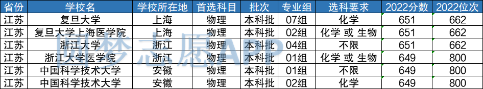 可以看到,2022年江苏省高考650分左右的考生可以报考复旦大学651分、浙江大学651分、中国科学技术大学649分等。