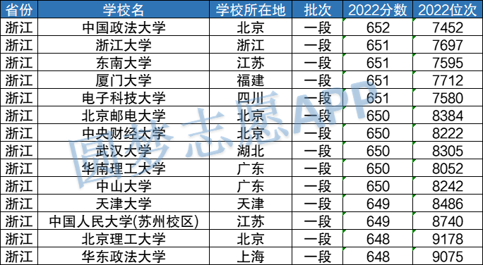 可以看到,2022年浙江省高考650分左右的考生可以报考中国政法大学652分、浙江大学651分、北京邮电大学650分等。