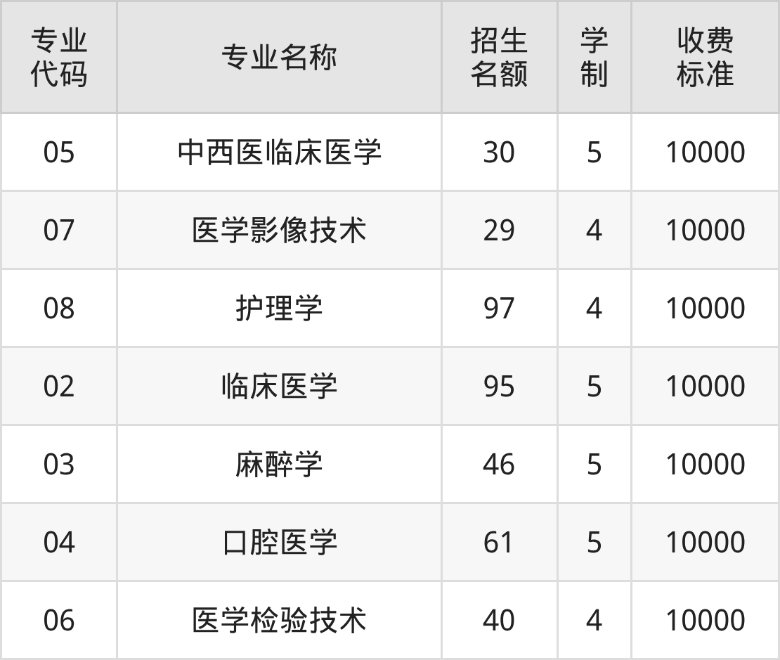 | 专业 代码 | 专业名称 | 招生 名额 | 学 制 | 收费 标准 |