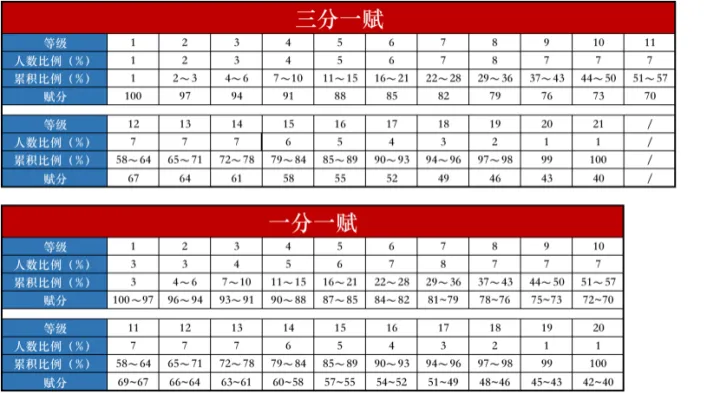 从两张表中可以看出:三分一赋中,只要考生的卷面分排在全省的前1%内,那么该考生就能赋分100分。