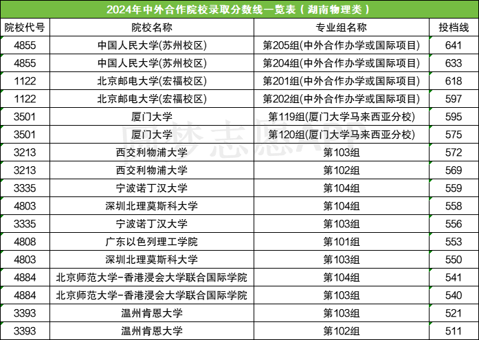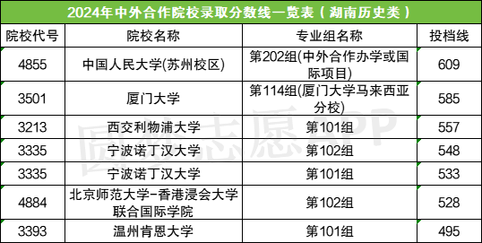 由于中外合作院校在各省的录取线都有所不同,小编在此以湖南省为例,整理了中外合作院校2024年在物理类和历史类的分数线,详情如下: