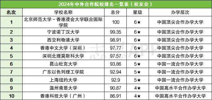 在中外合作院校中,分数排名靠前的有北京师范大学-香港浸会大学联合国际学院、宁波诺丁汉大学、西交利物浦大学、香港中文大学(深圳)、深圳北理莫斯科大学。