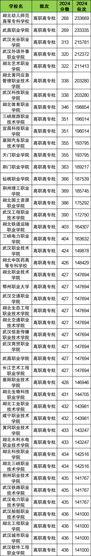 下面是2024年湖北专科院校录取分数线一览表: