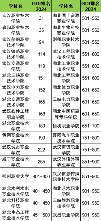 本文以2024年GDI全国高职高专院校排名为参考依据,列举湖北省内专科院校的全国排名情况,其中排名前5的分别为: