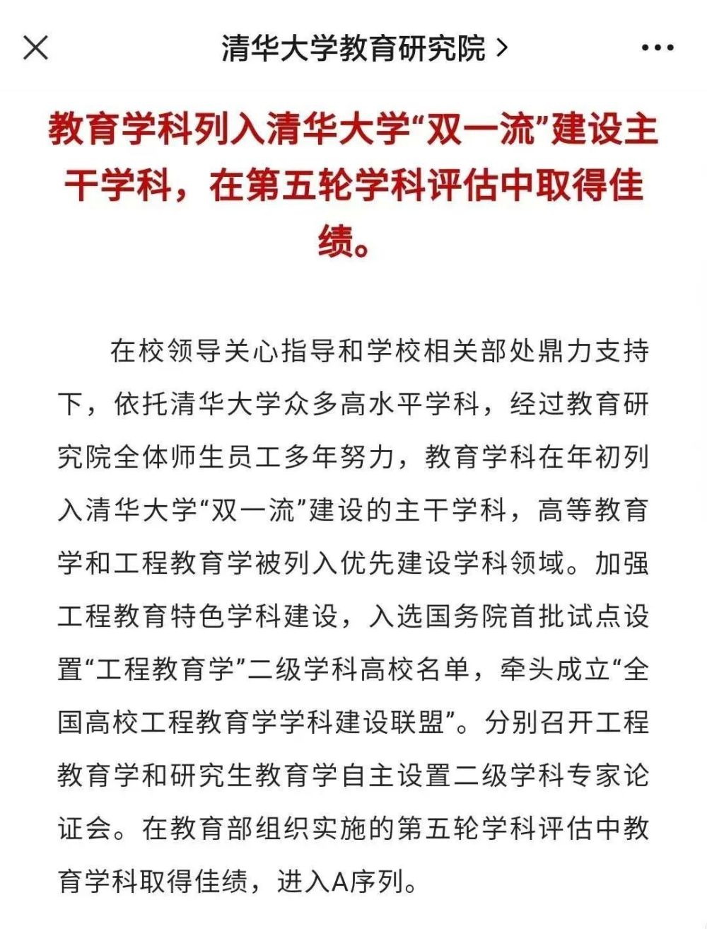 在12月31日,清华大学教育研究院官微发布了“清华大学教育研究院十件大事”,其中提到了教育学科列入清华大学“双一流”建设主干学科,在第五轮学科评估中进入A序列。