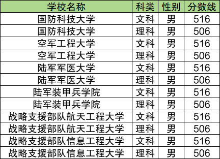 2024年在山西文科招生的军校录取分数线是516分,收分最低的学校为国防科技大学、陆军装甲兵学院、陆军军医大学等。