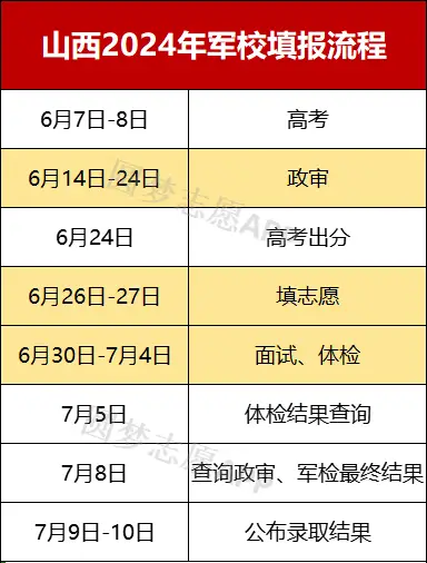 2025年山西军校报考流程主要包括填报志愿(6月26日-27日)、政审(6月14日-24日)、面试体检(6月30日-7月4日)等。想要报考军校需要满足未婚、年龄16到20岁、符合军队院校体检标准等条件。完整流程及时间安排表如下。