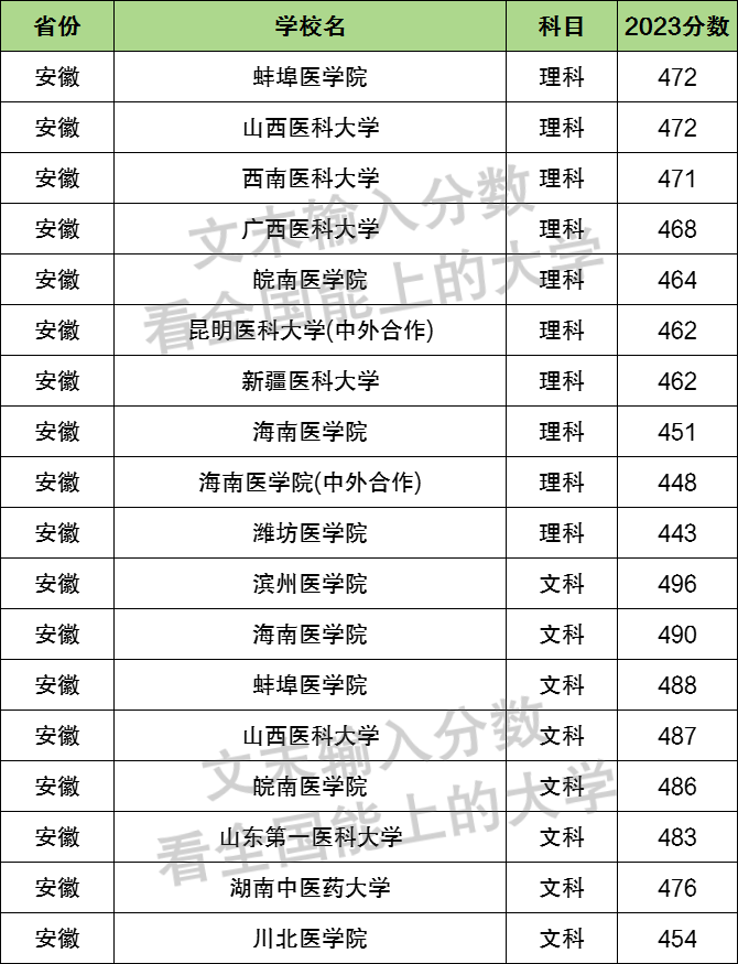 1、在安徽省最低分的二本口腔医学大学中,理科有新疆医科大学、海南医学院、潍坊医学院等大学,分数线最低仅为443分。文科有山东第一医科大学、湖南中医药大学、川北医学院等大学,分数线最低只需要454分。