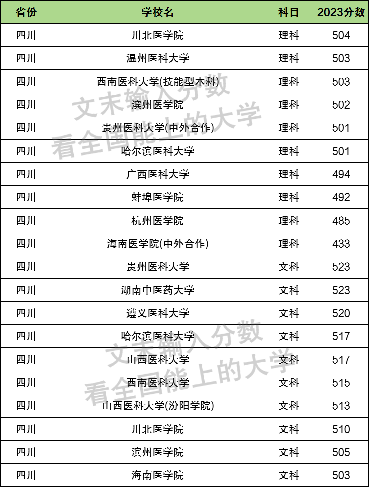 2、在四川省最低分的二本口腔医学大学中,理科有蚌埠医学院、杭州医学院、海南医学院(中外合作)等大学,分数线最低仅为433分。文科有川北医学院、滨州医学院、海南医学院等大学,最低503分就能考上。