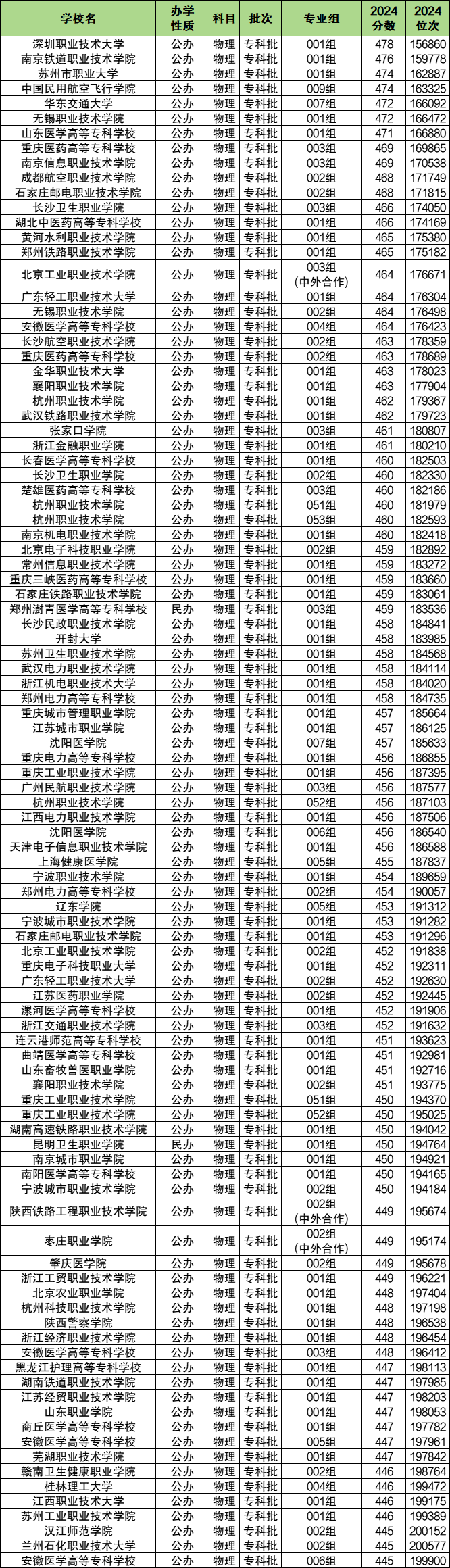 专科批大学中分数线最高的是深圳职业技术大学001组(478分),另外分数线较高的还有南京铁道职业技术学院001组(476分)、苏州市职业大学001组(474分)、中国民用航空飞行学院009组(474分)。