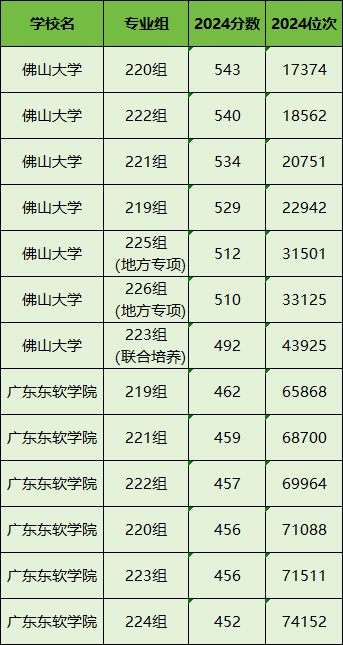 2024年佛山历史类录取分数线最低,最好考的大学是:广东东软学院224专业组452分,招生专业是日语。