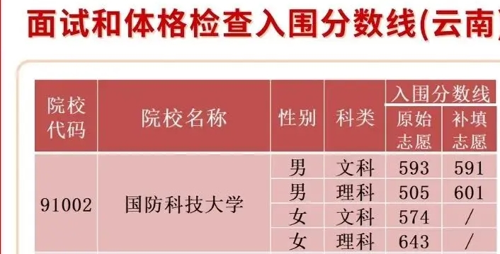 2024年国防科技大学在宁夏提前批文科男生最低499分,理科男生最低532分、女生最低562分;在四川体检面试分数线文科男生544分,女生591分;理科男生578分,女生648分。