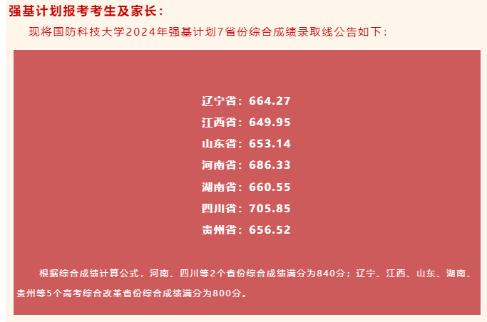 2024年国防科技大学已公布在部分省市强基计划录取分数线和本科提前批的投档分数线以及体检面试分数线,如国防科技大学2024年强基计划在山东省的录取分数线为653.14分;四川省的录取分数线为705.85分。