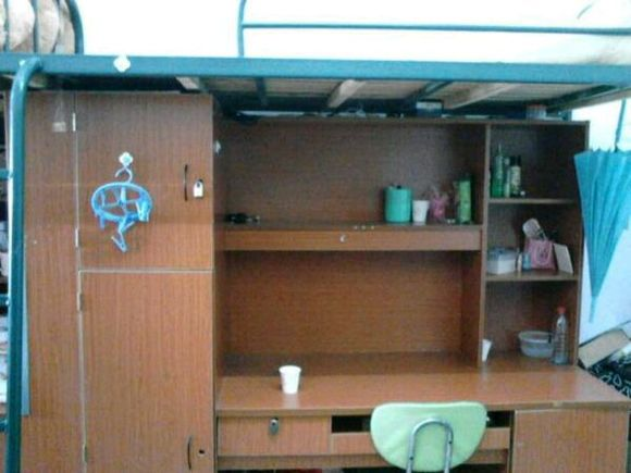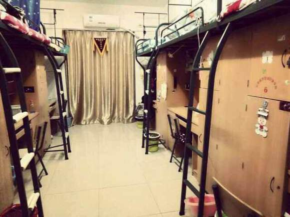 宿舍基本上都是六人间,一层楼只有一个四人间。上铺下桌,柜子、书桌,安装有空调、网络,有24小时安保、宿管人员巡查。