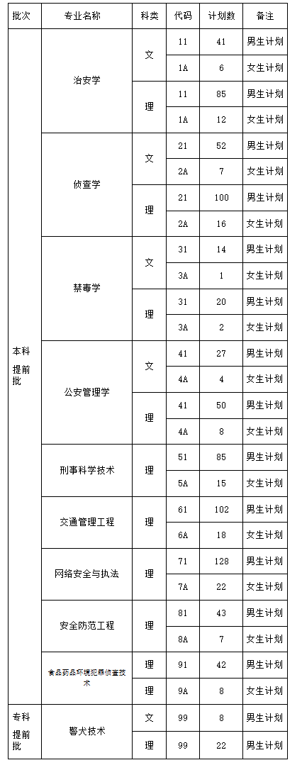 公安本科专业9个(本科提前批):治安学、侦查学、禁毒学、公安管理学、刑事科学技术、交通管理工程、网络安全与执法、安全防范工程和食品药品环境犯罪侦查技术;