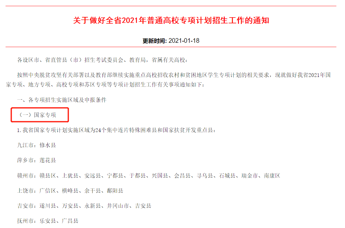 《通知》中详细列举了江西省国家专项计划的实施区域,2022年的实施区域可能会有一些变化和调整,但老师认为差别应该不会很大。