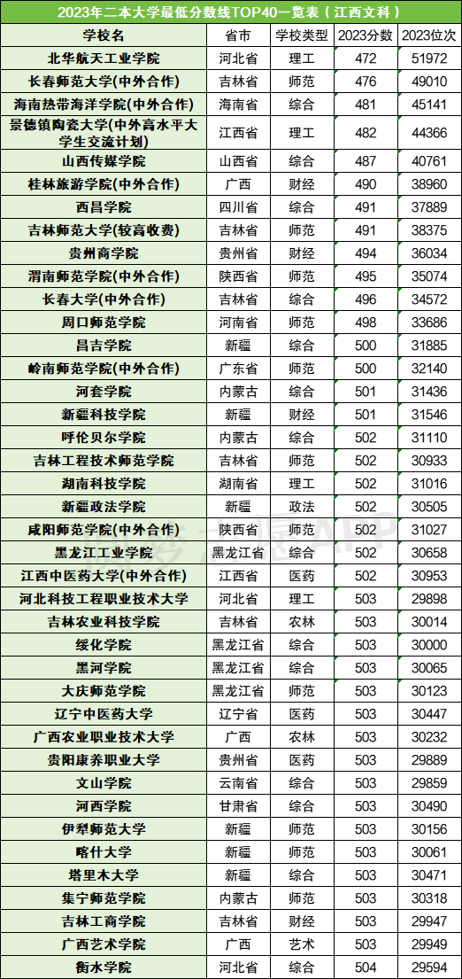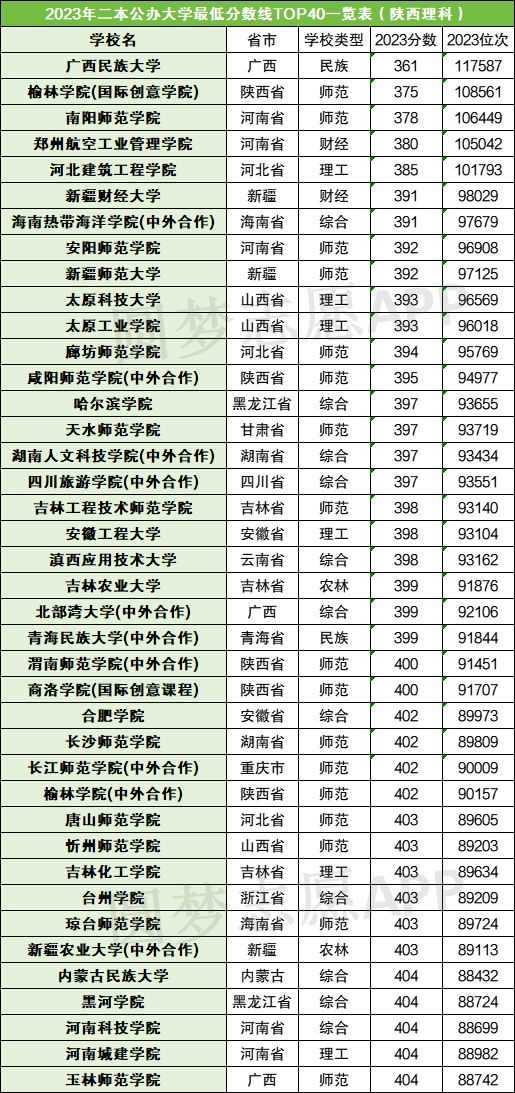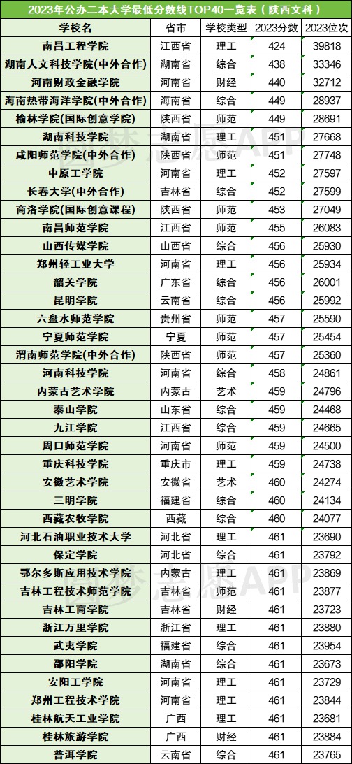 小编在此根据圆梦志愿提供的数据,以陕西和江西为例,整理了2023年二本院校在这两个省市的最低录取分数线TOP40一览表,如下: