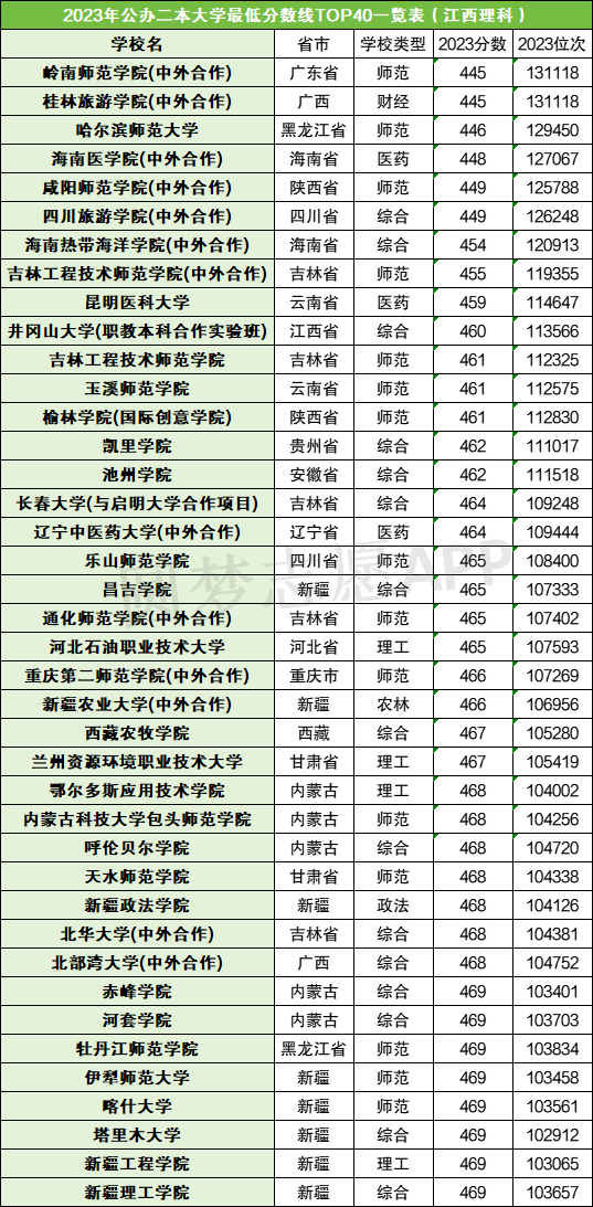以江西2023年的招生数据为例,理科投档线最低的院校有哈师大、岭南师院(中外合作)、昆医大、吉林工师(中外合作),这些院校的分数在445-459分之间。