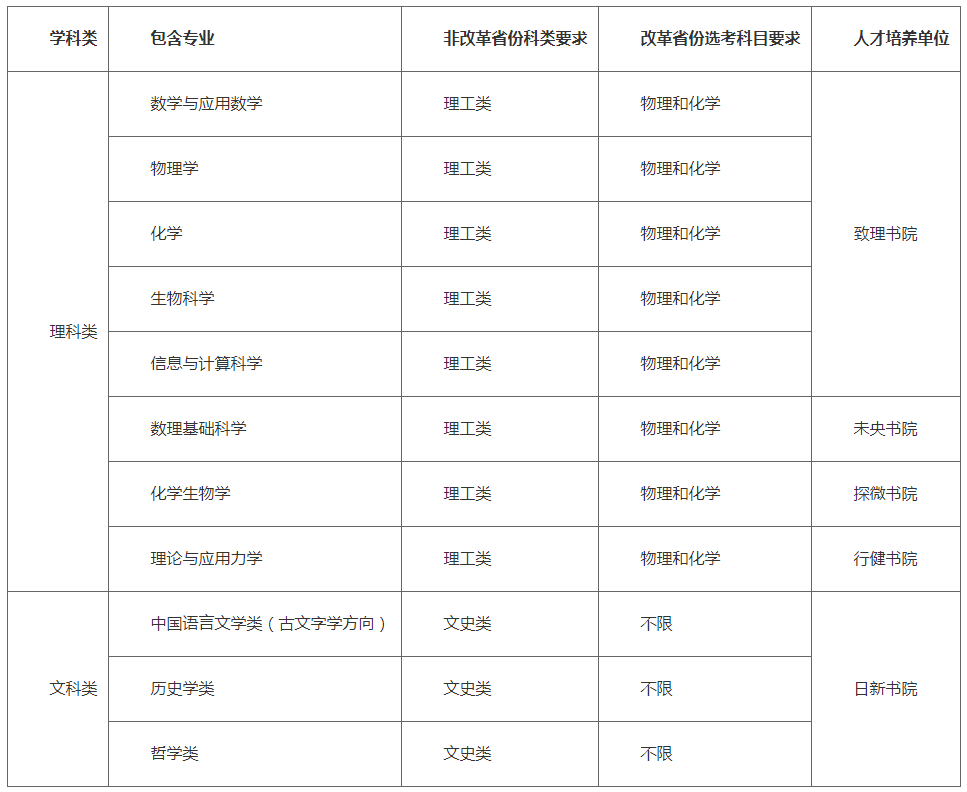 数学与应用数学、物理学、化学、生物科学、信息与计算科学、数理基础科学、化学生物学、理论与应用力学、中国语言文学类(古文字学方向)、历史学类、哲学类