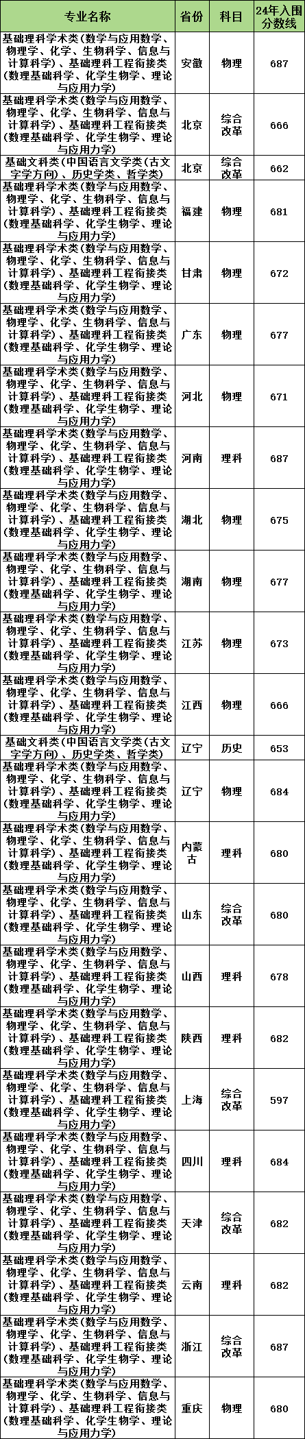 可见不同专业在不同省份的招生分数门槛各有差异,下面以基础理科学术类(数学与应用数学、物理学、化学、生物科学、信息与计算科学)、基础理科工程衔接类(数理基础科学、化学生物学、理论与应用力学)和基础文科类(中国语言文学类(古文字学方向)、历史学类、哲学类)为例,列举各省入围最低分: